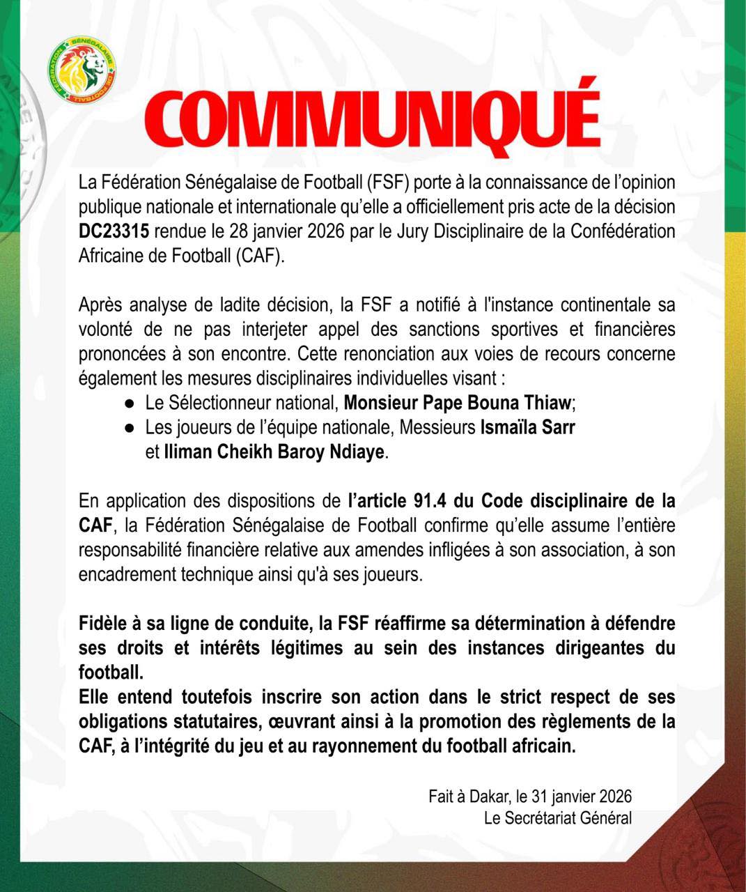 وأضاف البيان أنه، وبعد دراسة حيثيات القرار، أبلغ الاتحاد السنغالي لكرة القدم الهيئة القارية اختياره عدم الطعن أو الاستئناف في العقوبات الصادرة، سواء تلك المتعلقة بالاتحاد نفسه أو بالإجراءات التأديبية الفردية المتخذة في حق المدرب بابي ثياو، ولاعبي المنتخب إسماعيلا سار وإيليمان نداي.
