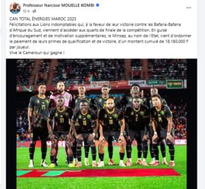 تهانينا لأسود الكاميرون غير المروّضة الذين، بفضل فوزهم على منتخب جنوب إفريقيا «بافانا بافانا»، تمكنوا من بلوغ دور ربع نهائي المسابقة. وكحافز وتشجيع إضافيين، أصدر وزير الرياضة والتربية البدنية، باسم الدولة، تعليماته بصرف منح التأهل والفوز لفائدة اللاعبين، بقيمة إجمالية قدرها 18.180.000 فرنك إفريقي لكل لاعب.