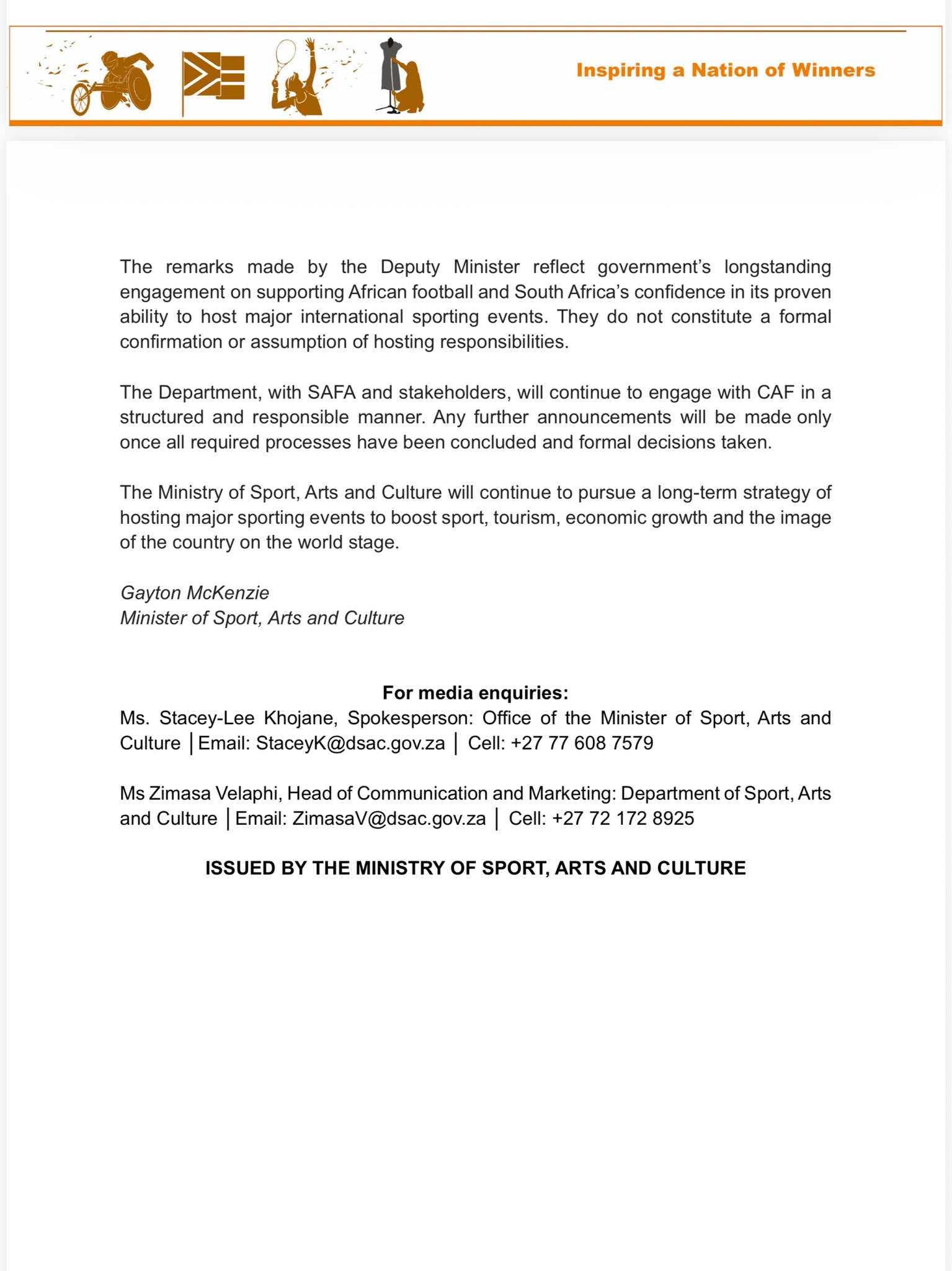 وستواصل الوزارة، بالتعاون مع الاتحاد الجنوب أفريقي لكرة القدم وأصحاب المصلحة، الانخراط مع الاتحاد الأفريقي لكرة القدم بطريقة منظمة ومسؤولة. ولن يتم الإعلان عن أي مستجدات أخرى إلا بعد استكمال جميع الإجراءات المطلوبة واتخاذ القرارات الرسمية.