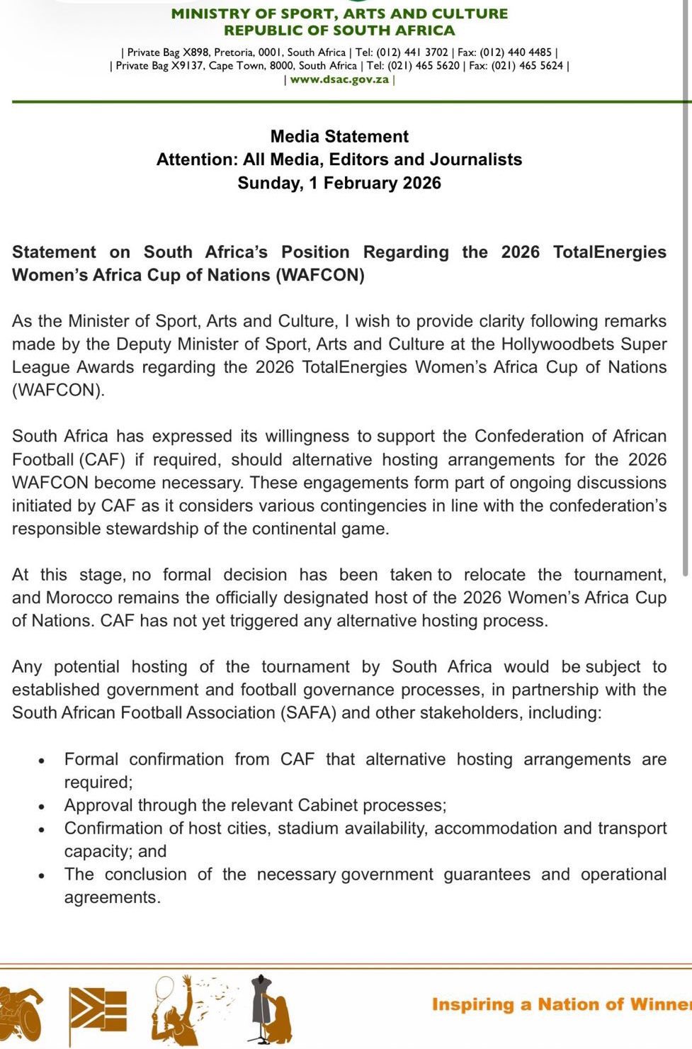 بصفتي وزير الرياضة والفنون والثقافة، أود تقديم توضيح عقب التصريحات التي أدلى بها نائب وزير الرياضة والفنون والثقافة خلال حفل جوائز دوري هوليوودبيتس الممتاز، والمتعلقة بكأس الأمم الأفريقية للسيدات 2026 (WAFCON).